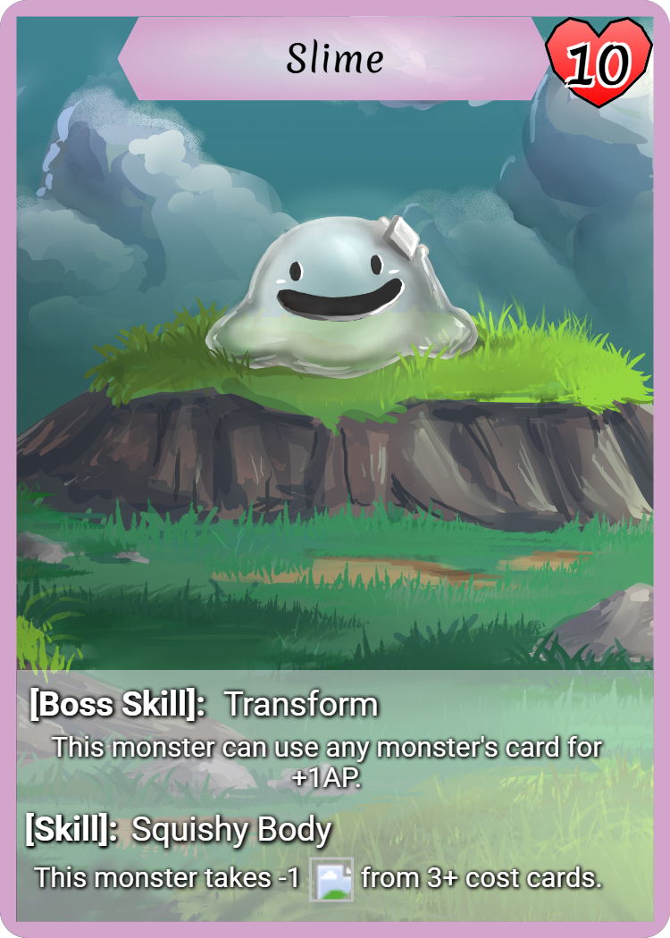 Each monster has its own HP value and 2 skills: one that's always active, and one that's reserved for the monster you pick as your Boss. The Boss Monster also gains a 2nd benefit; they cannot be targeted by actions until one of your other monsters is defeated.