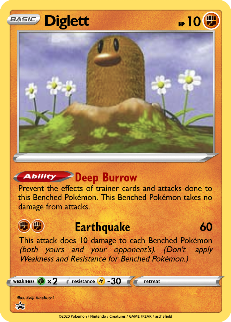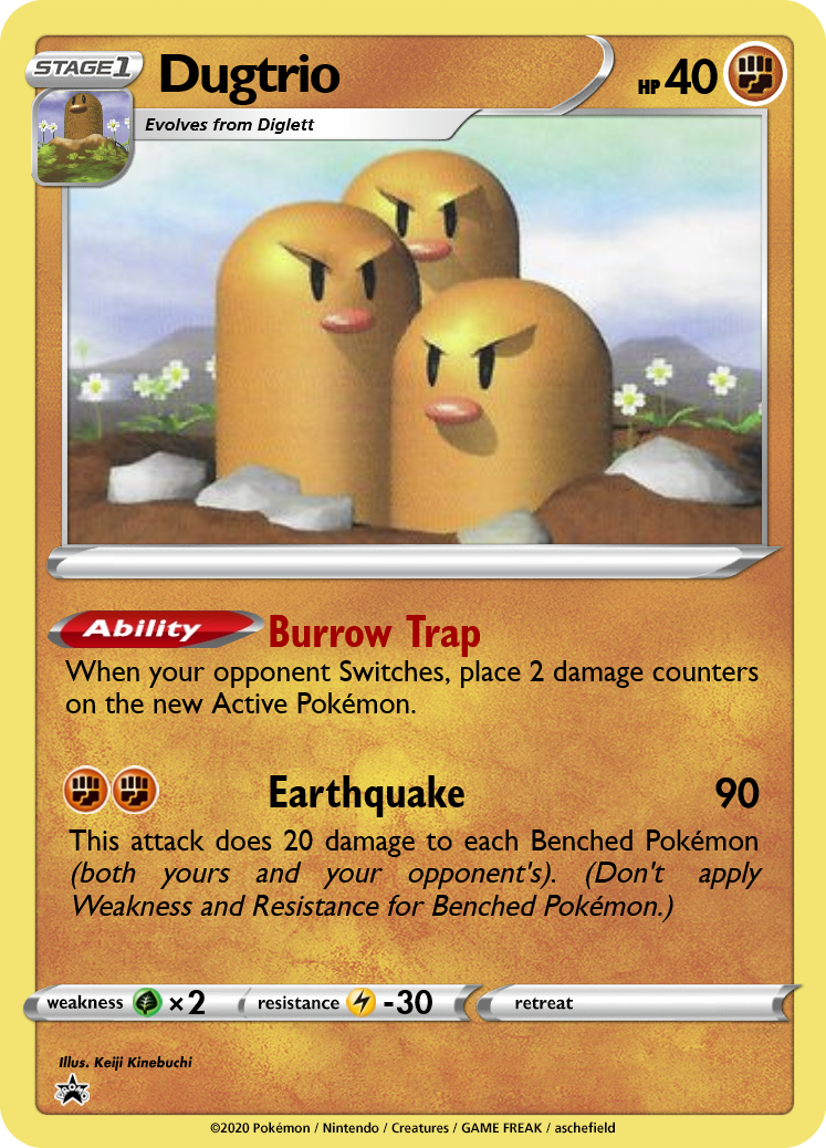 The Diglett line have some of the lowest base HP values in the game. As one of my design goals is to keep the "feel" of many Pokémon in tact, these values have not been artificially buffed. With an evolution line focused on Speed and Attack, both have no retreat, and both deal damage well above curve for their Energy costs. Diglett features a more defensive ability that offers immunity from gusting, damage counters, and snipe damage. Dugtrio goes full glass cannon, damaging the opponent with Burrow Trap whenever the opponent switches out. With Honeypot and Burrow Trap in effect, the total damage from a Switch can go up to 100!