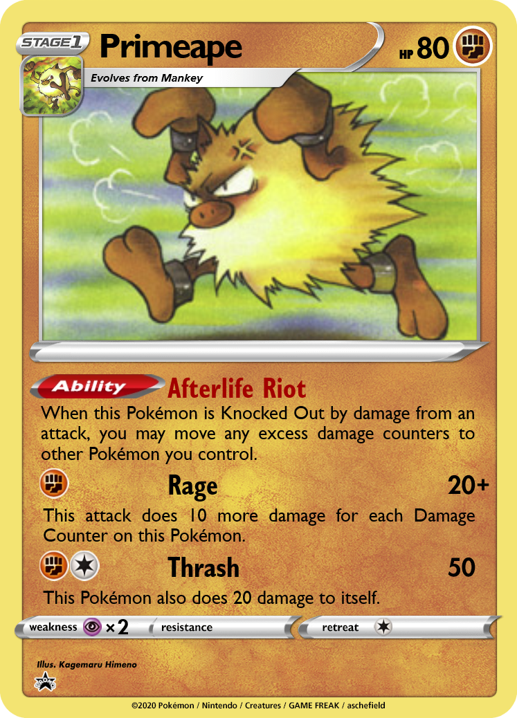 The main issue with Rage attacks is keeping your Pokémon sufficiently damaged. Primeape's Afterlife Riot allows you to keep any extra damage counters. For example, if a 10HP Primeape takes 30 damage, you'll be able to move 2 damage counters to other Pokémon, instantly turning Rage into a decent 30 or 40-for-1 attack. Keeping your Pokémon damaged makes them easier to OHKO, but you can gain an advantage over the course of the game by using cost-efficient attacks (Rage only costs 1 Energy, after all).