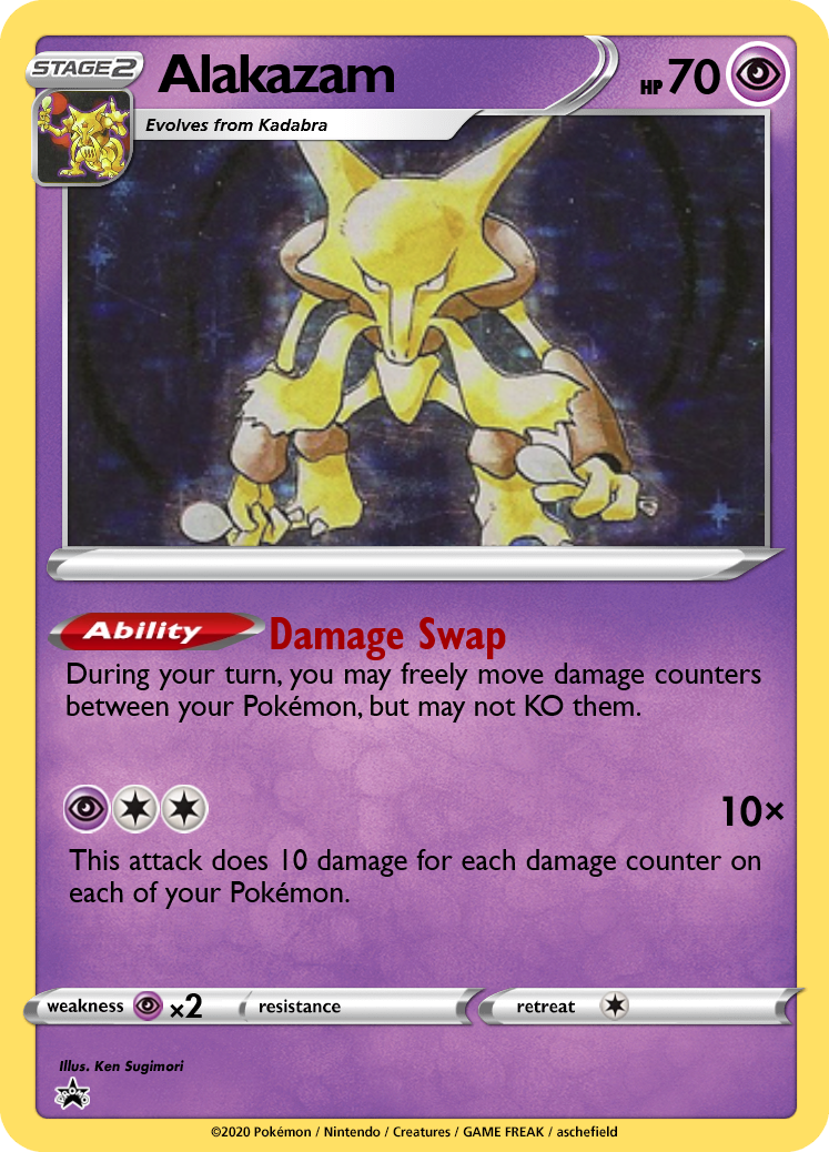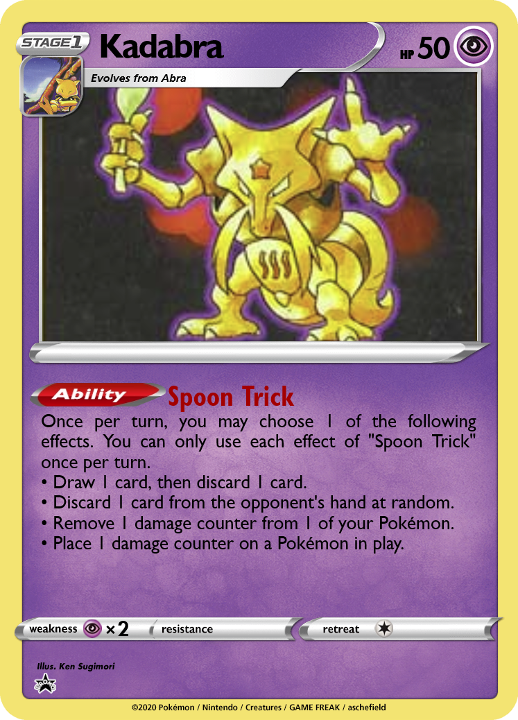 The Alakazam line also supports Rage strategies by allowing free manipulation of damage counters. It only has 70hp, but Psyshock can deal over 100 damage if you've tanked a few hits with Damage Swap first. Kadabra has no attacks, but 4 unique effects on Spoon Trick, making it a support Pokémon that can fit into a variety of decks.