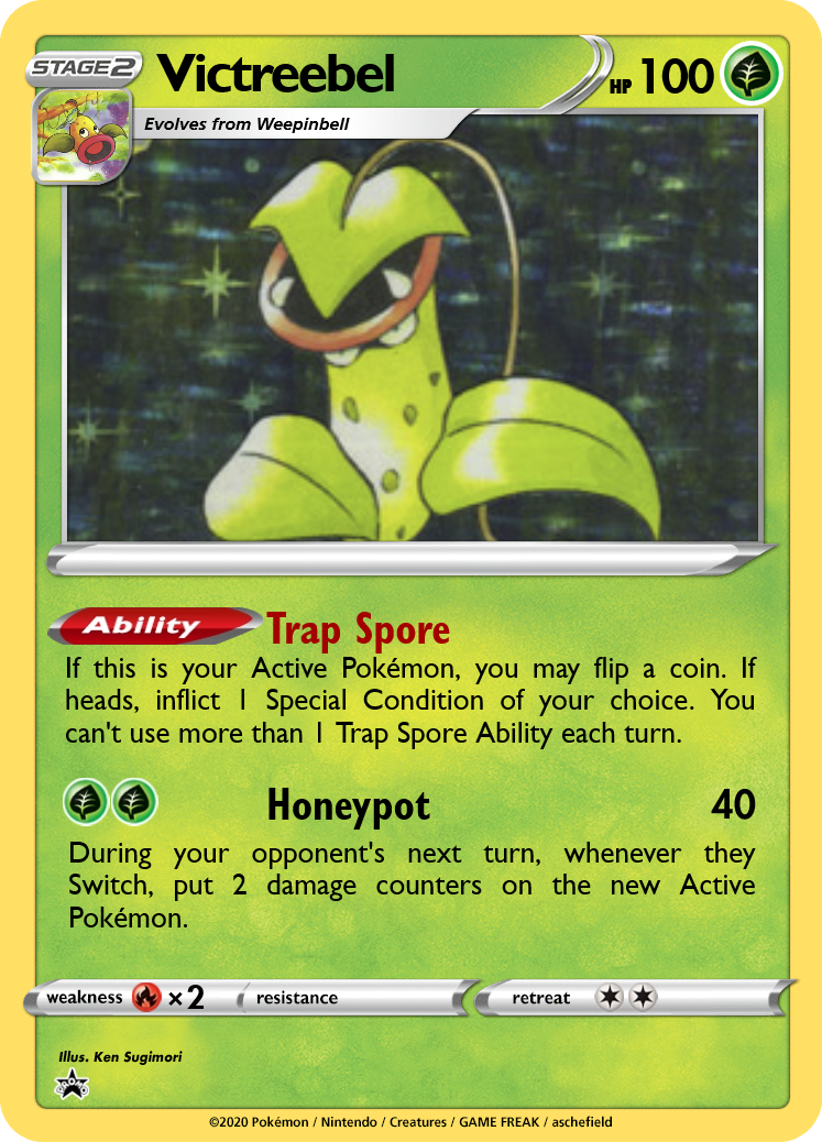 Victreebel is the main allure of the line, with Trap Spore being able to inflict any Status Condition. Paralysis is going to be the choice in most cases, but Burn and Poison can help pick up a KO. Putting on status conditions can force the opponent to switch, which Victreeebel punishes with Honeypot!