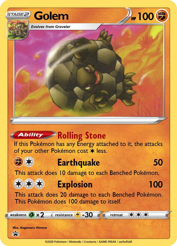 Golem's Earthquake is less powerful than Dugtrio's, but it is easier to use. If you can take one Knock Out with Earthquake, your damaged Golem can then explode for what's likely a 2nd prize. Rolling Stone also makes Golem a useful support Pokémon.