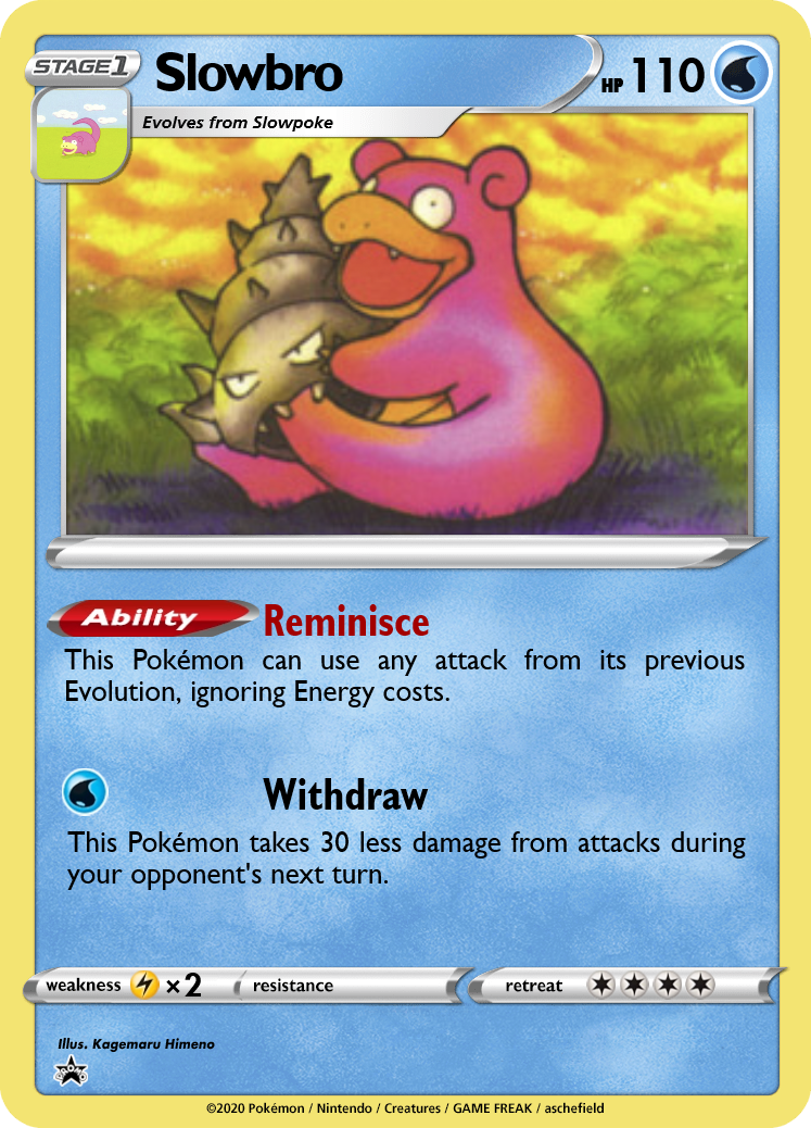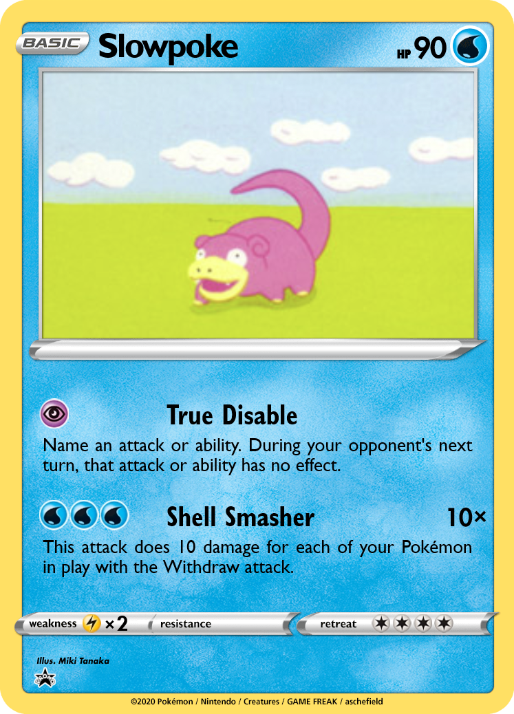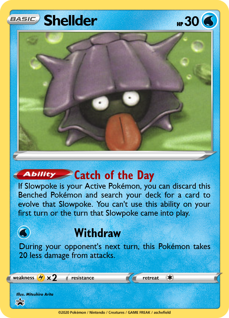 Slowpoke has an attack similar to Wigglytuff's original Do the Wave, but it only counts Pokémon with Withdraw. Slowpoke probably won't end up using it though, as Slowbro can copy the attack for no Energy! You'll also need to manage your bench properly; Shellder can search for Slowbro, but discards itself from play, reducing the number of Pokémon with Withdraw in play. Additionally, if you want to maximize damage from Shell Smasher, you can't have any support Pokémon like Persian or Pidgeot on your bench.