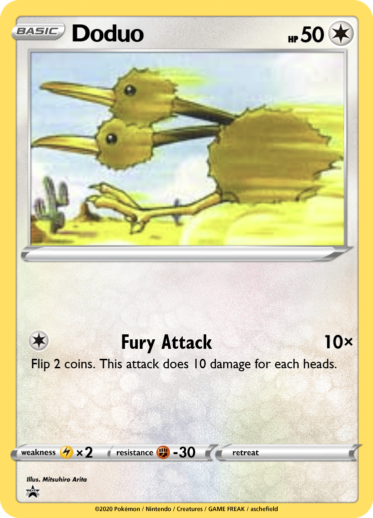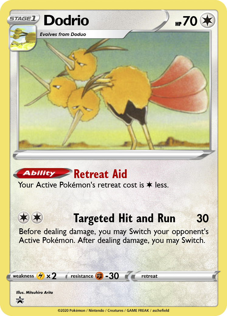 With most Pokémon having 1-2 Retreat, a single Tentacruel is hitting 40 or 60 for 2, with the potential to scale higher with additional copies set up. However, players can counteract this with Dodrio and its Retreat Aid ability! Doduo is an extremely rare case: I've changed no attributes of this card compared to the original Base Set. Dodrio, however, has a nifty new attack. By gusting the opponent, we dodge abilities that prevent benched damage (e.g. Squirtle, Machoke) and can potentially strand an Active Pokémon--especially if paired with Tentacruel to increase the Retreat Cost! Lastly, switching out Dodrio after the attack allows us to switch in Pokémon like Charizard, Venomoth, or Machamp, which punish the opponent for attacking into them.