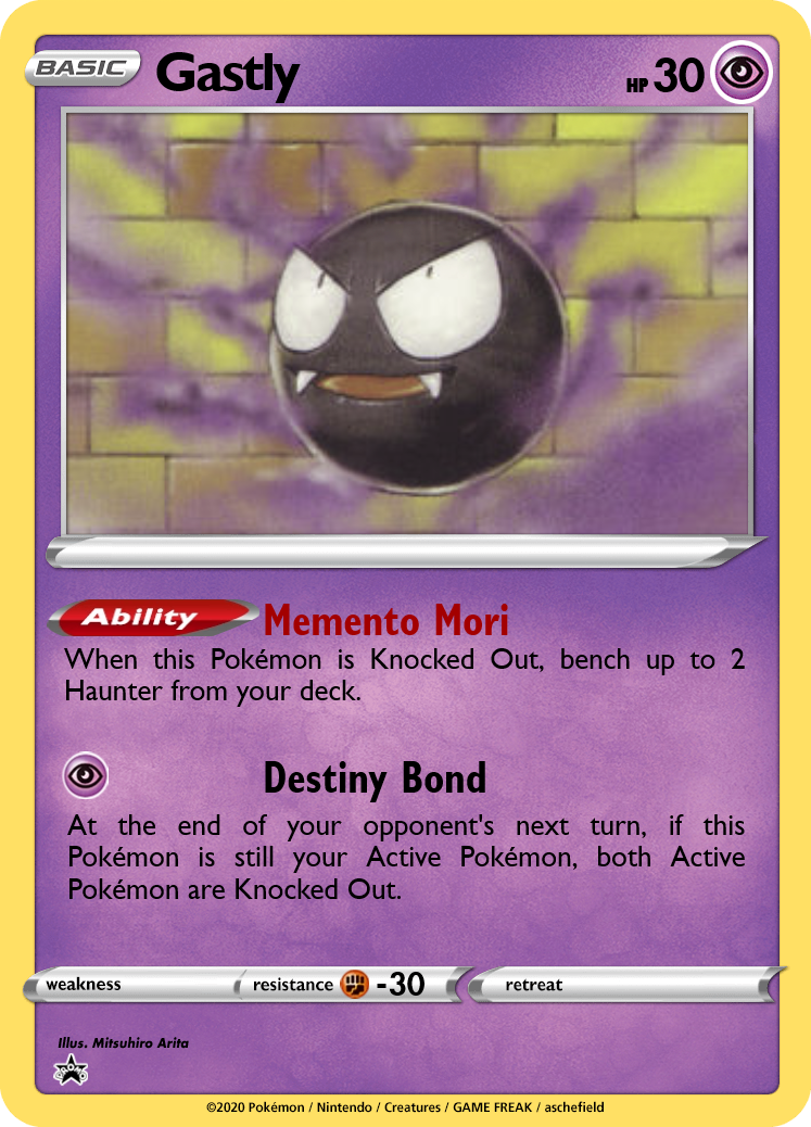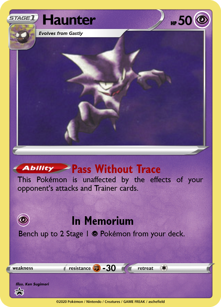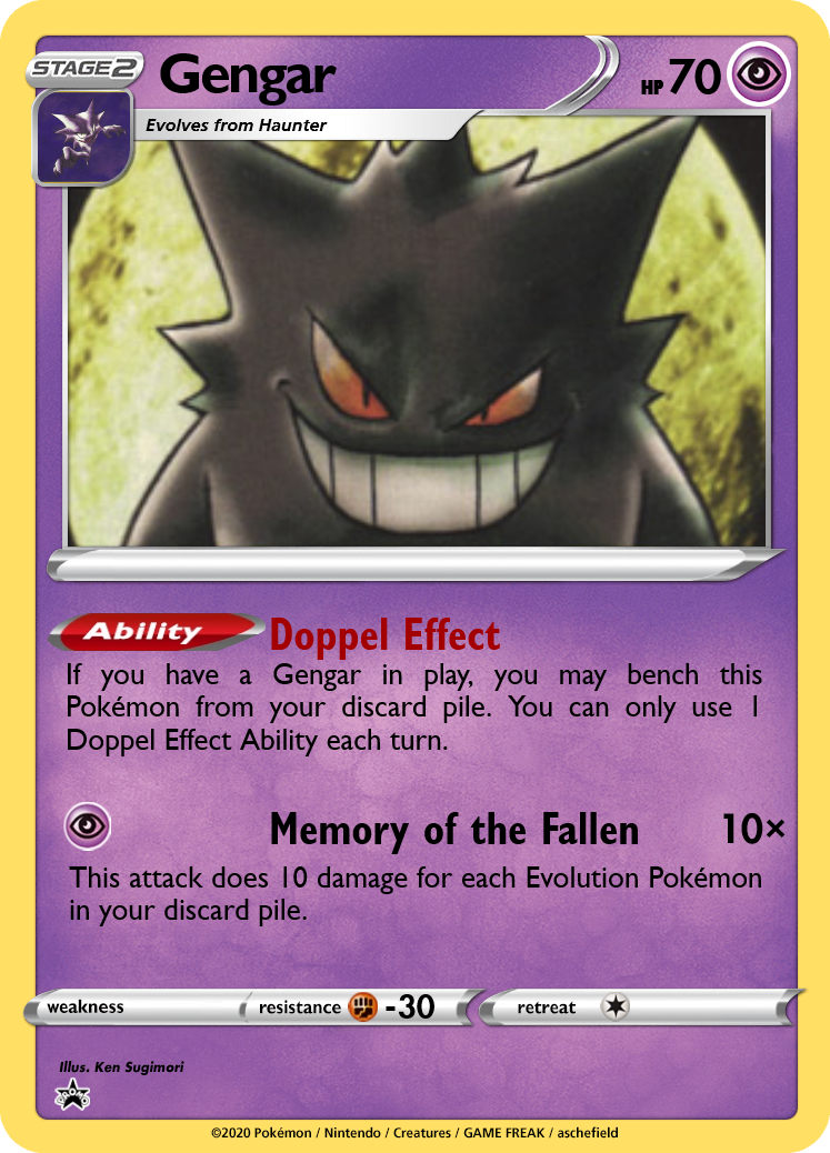 All 3 members of this line have low HP for their Stage. To balance this out, I've given them a focus on cheating Pokémon into play; you never know when a ghost might appear! Gastly and Haunter both accelerate Stage 1 Pokémon into play, while Gengar deals damage based on the number of Evolution Pokémon you've discarded. Players can use Haunter's In Memorium to set up copies of Kadabra or Hypno without running any Abra or Drowzee. Avoiding the need to evolve Pokémon lets players aggressively use cards like Professor Oak and Computer Search to power up Gengar's attack. And, once one Gengar is set up, you can start chaining a new Gengar each turn.