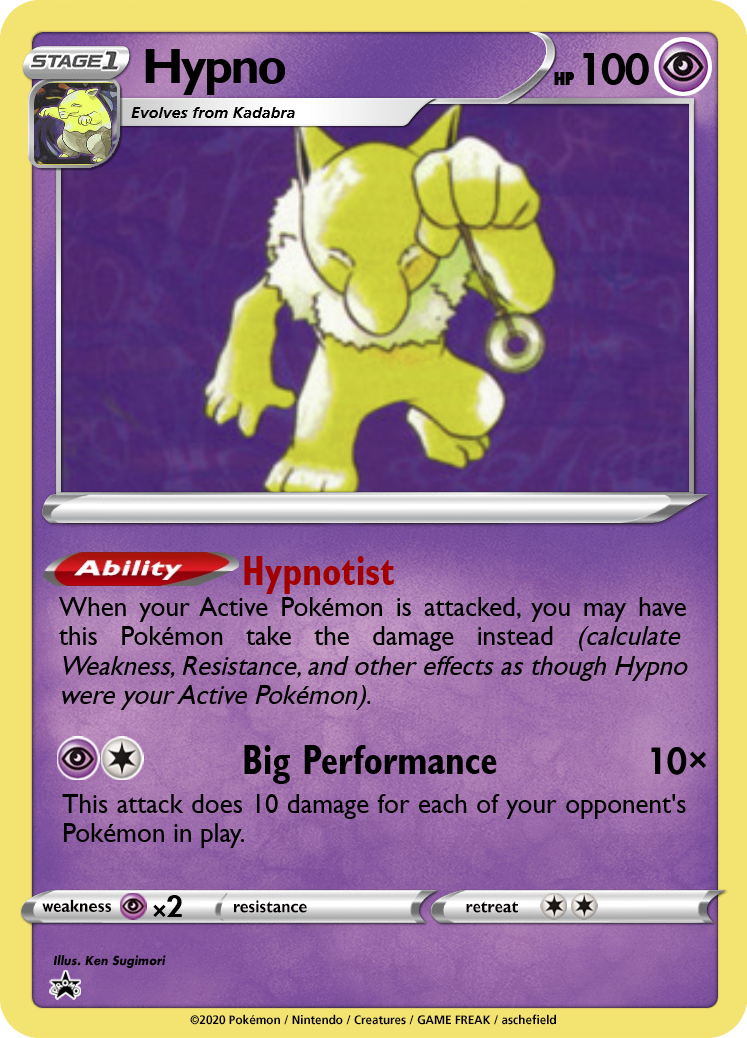 The original Drowzee card focused on Confusion(???) instead of Sleep, so this has been corrected. Dream Eater deals big damage, but it's unlikely to work without support from Parasect. Hypno is a natural partner for any deck that relies on low-HP attackers. Your 40-HP Dugtrios and 70-HP Alakazams now gain a 100-hp shield, which also prevents them from losing Energy when the shield gets Knocked Out.