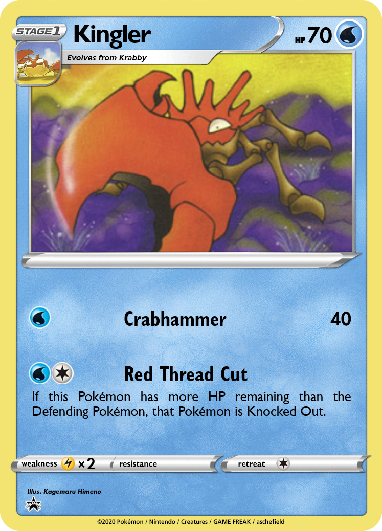 Red Thread Cut is a situational attack that KOs any Pokémon weaker than Kingler. With 70HP, a healthy Kingler can Knock Out most evolving basics, and even some Stage 1s. Unlike Machamp's Fissure, Kingler will struggle to deal with high-hp basic EXes, but Kingler can be a great secondary attacker, essentially dealing up to 60 for 2 against weakened opponents.