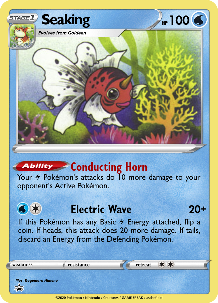 The Seaking line is inspired by its access to the Lightning Rod ability in the video games. Pair it with Lightning Pokémon like Electabuzz.