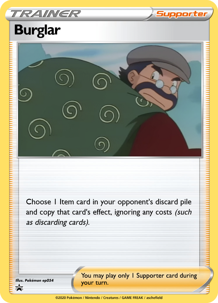 Ignoring the costs of item cards makes Burglar a versatile card, though it depends on the opponent's deck. Common targets could include Computer Search (no discard required) and Energy Removal (which no longer needs to discard one of your own Energy).