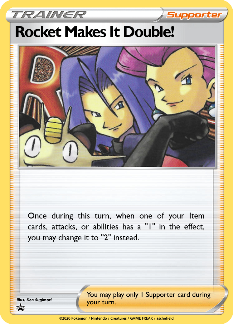 Rocket Makes It Double is a card designed with the intention of "let's see what happens." It does absolutely nothing on its own, but can lead to a wide variety of payoffs. Add 2 cards with Computer Search; finish the game early with Cubone's Lone Finish; put 6 cards back in your deck with Recycle. Note that you only get to replace one instance, so an attack like Goldeen's "Ride the Current" can attach 2 Energy to 1 Pokémon or 1 Energy each to 2 Pokémon, rather than accelerating 4 energy total.
